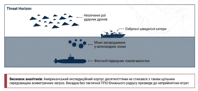 Саме в контексті підготовки до цієї надзвичайно небезпечної наземної фази виникає критична, стратегічна необхідність закріплення України та її фахівців у регіоні. Американський експедиційний корпус, незважаючи на свою абсолютну технологічну міць у сфері авіації та флоту, десятиліттями не стикався з таким щільним, насиченим та дешевим середовищем асиметричних загроз, яке Іран роками розгортав навколо Ормузької протоки. Для того, щоб гарантувати успішну висадку на добре захищений острів Харк або забезпечити утримання відвойованих плацдармів на небезпечному іранському узбережжі, морська піхота США критично потребуватиме безпрецедентного рівня тактичної протиповітряної оборони ближнього радіусу дії та віртуозної інтеграції безпілотних систем у бойові порядки в реальному часі.
