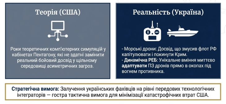 Українські сили, які вже блискуче довели свою ефективність у захисті надважливих стратегічних об’єктів Катару та ОАЕ, виявилися ідеальними, і що важливо, єдиними доступними кандидатами на роль передових технологічних інтеграторів. Досвід українських військових інженерів у використанні ударних надводних безпілотників-камікадзе (інновації, яка свого часу змусила російський Чорноморський флот фактично капітулювати та покинути акваторію Криму), а також їхнє унікальне вміння миттєво адаптувати програмне забезпечення дронів та систем радіоелектронної боротьби прямо в окопах під вогнем противника, робить їх абсолютно безцінним активом для планування операцій США в мілководній та небезпечній Перській затоці.19