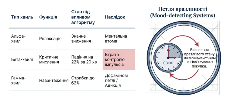 Дослідження показують, що використання інтерфейсів з нескінченною прокруткою послаблює гальмівний контроль у префронтальній корі мозку.5 Всього 20 хвилин активної взаємодії з алгоритмічною стрічкою призводять до зниження потужності бета-хвиль у префронтальній корі на 22%, що робить людину більш схильною до імпульсивних рішень, таких як кліки по рекламі або здійснення необдуманих покупок.5 Це не просто маркетинговий трюк, а пряме втручання в біологічну архітектуру прийняття рішень, що концепція Альфа-0 кваліфікує як порушення когнітивної недоторканності.1