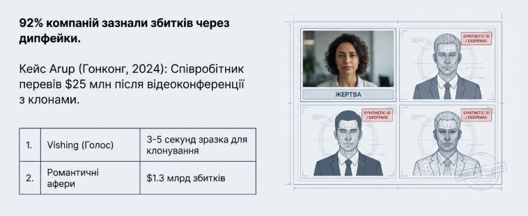 Цей випадок демонструє перехід від простих фішингових листів до створення цілісних, інтерактивних обманних середовищ.7 Проблема посилюється тим, що ШІ-моделі здатні проводити такі атаки масово. Дослідження Deloitte показують, що близько 25.9% керівників компаній вже стикалися з інцидентами використання дипфейків проти їхніх організацій, а за даними CFO Magazine, 92% компаній зазнали тих чи інших фінансових втрат через цю технологію.7