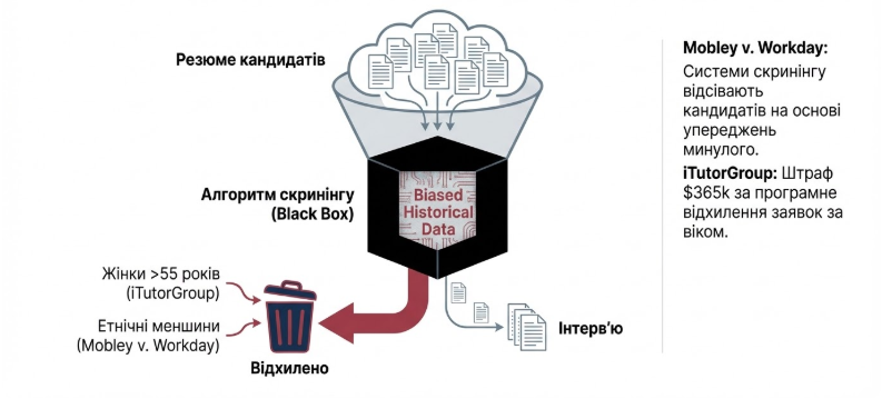 У 2025 році 88% компаній використовують автоматизовані системи скринінгу резюме.17 Позов Дерека Моблі проти компанії Workday став знаковим: афроамериканець старше 40 років з інвалідністю стверджує, що ШІ-інструменти Workday систематично відсівали його кандидатуру, навчаючись на історичних даних, які містили людські упередження минулих десятиліть.15 Суд у Каліфорнії визнав, що постачальник ШІ-інструментів може вважатися «агентом роботодавця» і нести пряму відповідальність за дискримінацію.15