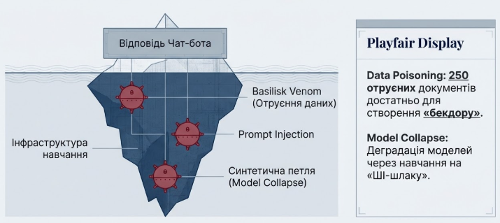 Всього 250 отруєних документів у вибірці з мільярдів токенів достатньо для створення «бекдору» в моделі.1 Це дозволяє хакерам або іноземним спецслужбам створювати «сплячих агентів» усередині ШІ, який керує енергетикою чи фінансами країни.35