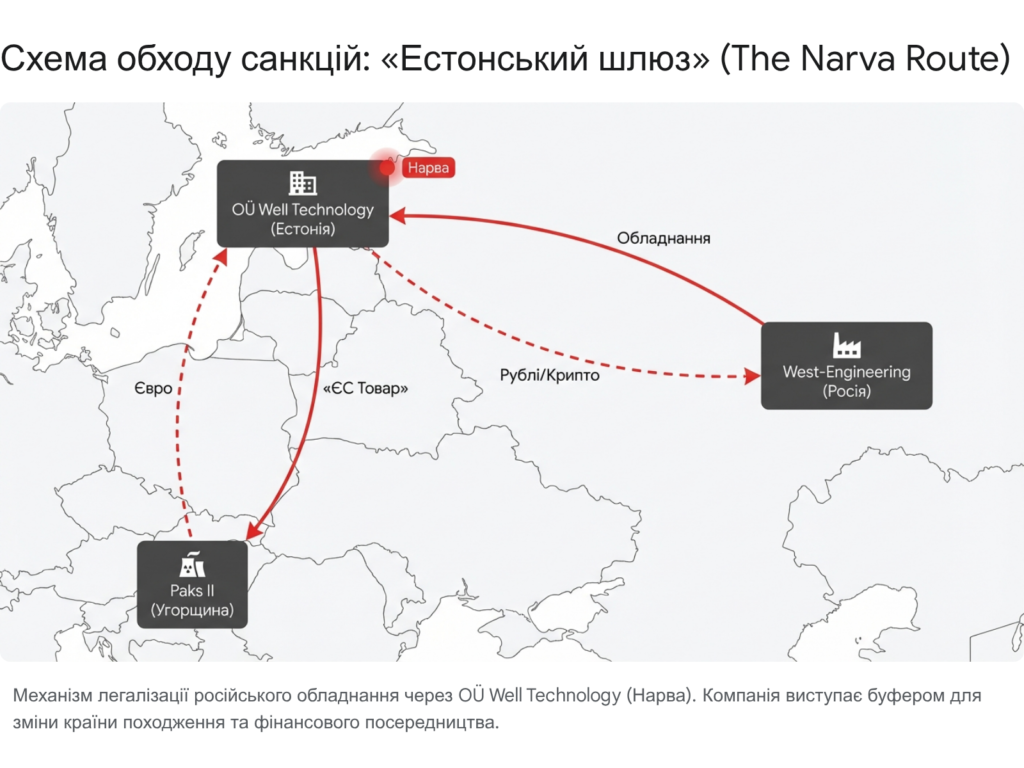 Розслідування виявило критичну точку входу російського атомного комплексу в юридичне поле Євросоюзу через Естонію. Компанія OÜ Well Technology (реєстраційний код 12843577), зареєстрована в місті Нарва, ідентифікована як ключовий елемент схеми легалізації обладнання, сертифікації та фінансових транзакцій.