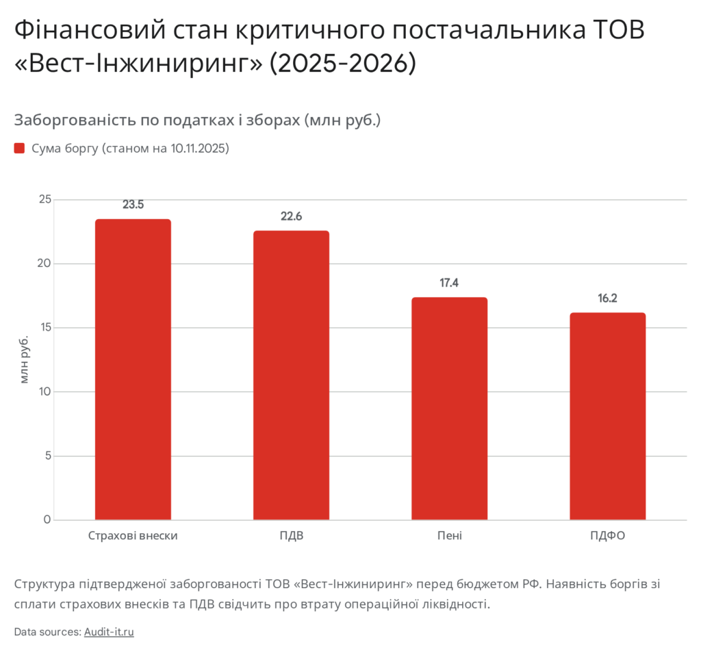 | ТОВ «Вест-Інжиниринг» | РФ | Фінансова неспроможність (борги >80 млн руб), загроза Supply Chain Safety | 5 | КРИТИЧНИЙ |