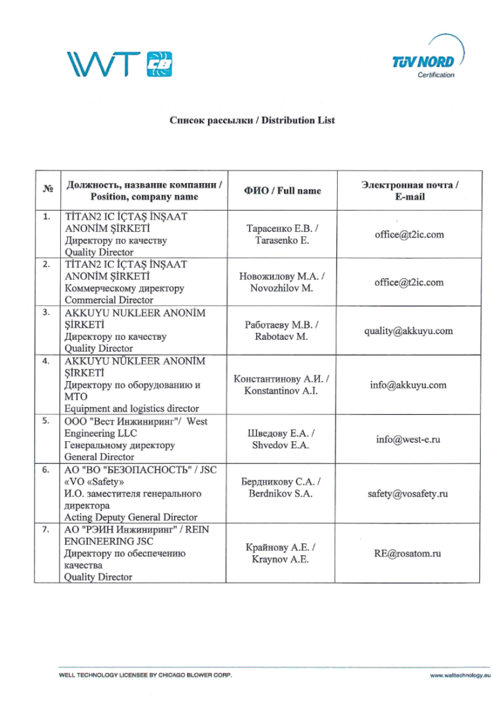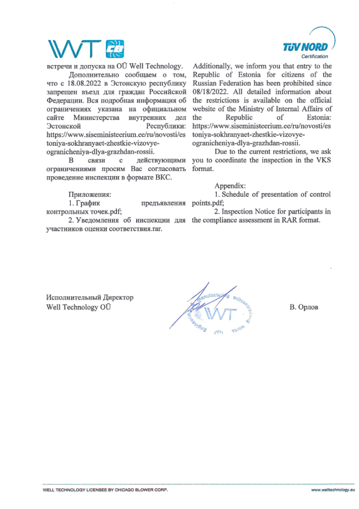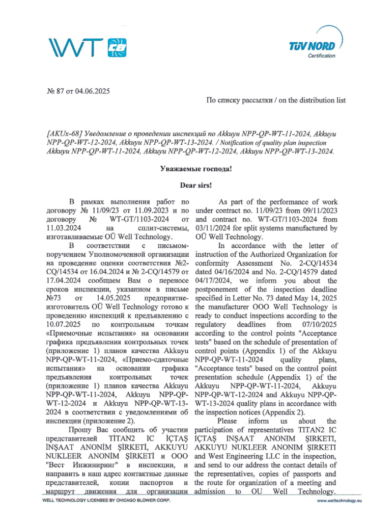 Документально підтверджено, що OÜ Well Technology залучалася до інспекцій якості та нагляду за виготовленням обладнання для АЕС «Аккую» (Туреччина), генеральним підрядником якої є російський «Титан-2».13 Лист TUV NORD № 87 від 04.06.2025 підтверджує участь цієї естонської компанії в процедурах оцінки відповідності.