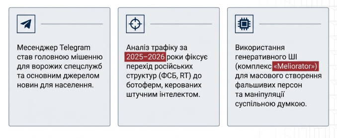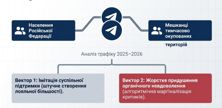 Ключовим полем бою за свідомість населення Російської Федерації та мешканців тимчасово окупованих територій залишається месенджер Telegram. Він є основним джерелом новин для більшості населення, що робить його головною мішенню для ворожих спецслужб. Аналіз трафіку за 2025–2026 роки чітко вказує на масштабне використання ботоферм, керованих штучним інтелектом, для імітації суспільної підтримки та одночасного жорсткого придушення органічного невдоволення.7