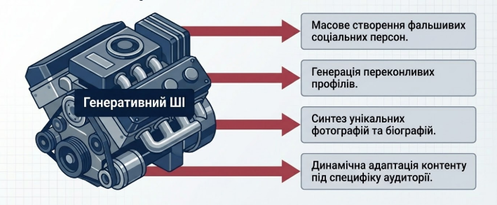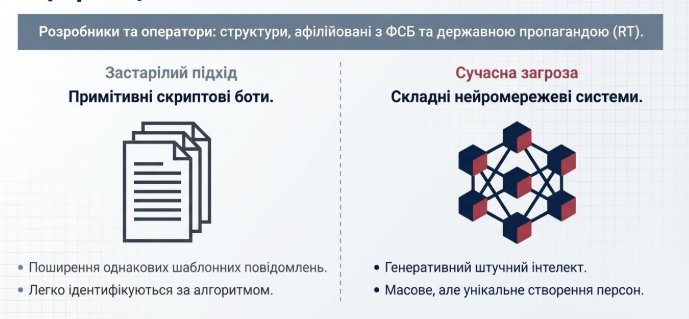 Російські інформаційні війська (зокрема, структури, афілійовані з ФСБ та державною пропагандою, як-от RT) здійснили якісний технологічний стрибок. Відбувся перехід від примітивних скриптових ботів, які поширювали однакові шаблонні повідомлення, до складних нейромережевих систем. Головним інструментом цієї нової ери став програмний комплекс «Meliorator» — інструмент на базі генеративного ШІ, розроблений для масового створення фальшивих соціальних персон.9