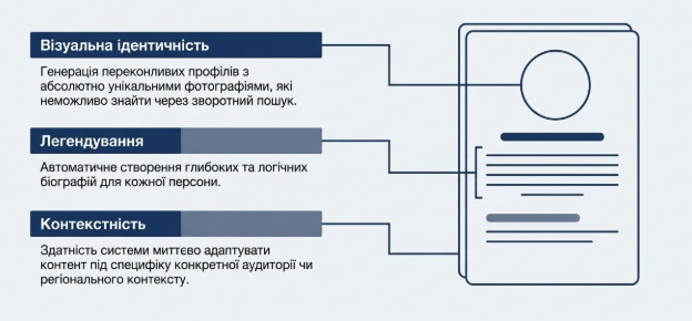 Діючий в РФ «Meliorator» (справжньої назви не відомо) здатний не лише генерувати переконливі профілі з унікальними фотографіями та біографіями, але й адаптувати контент під специфічну аудиторію, імітувати стиль спілкування реальних користувачів та створювати емоційно забарвлені повідомлення.9 Ця технологія дозволяє ворогу швидко реагувати на будь-які події, генеруючи тисячі коментарів, що виправдовують дії російського керівництва або розпалюють ворожнечу щодо України та країн Заходу.8