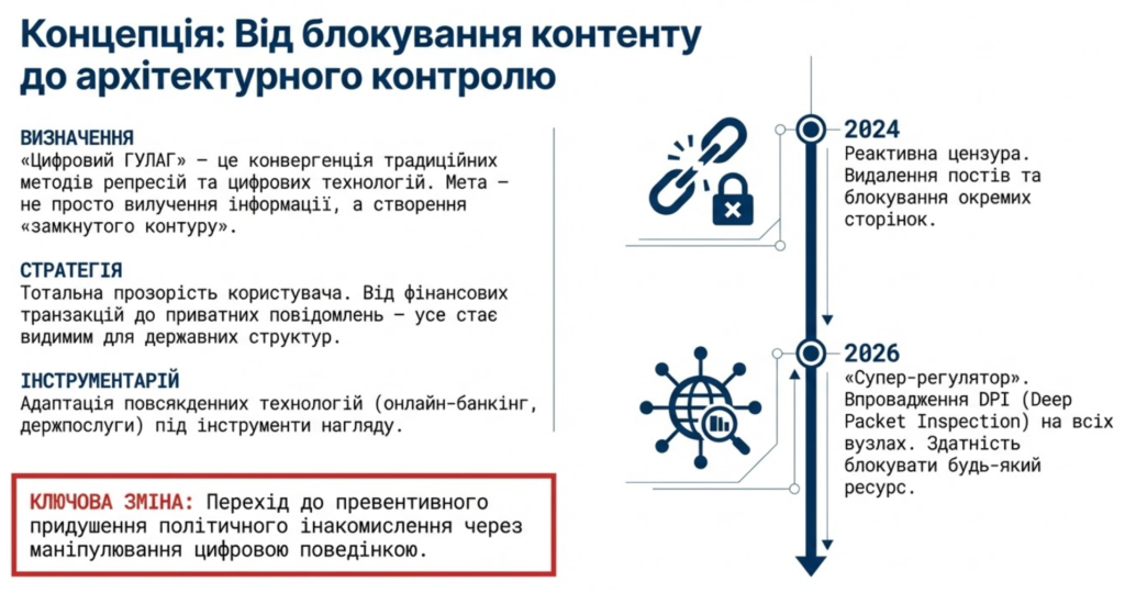 Трансформація російського сегмента інтернету в період 2024–2026 років знаменує собою перехід від реактивної цензури до проактивного архітектурного контролю. В експертному середовищі цей процес отримав визначення «Цифровий ГУЛАГ», що характеризується конвергенцією традиційних методів репресій та сучасних цифрових технологій.1