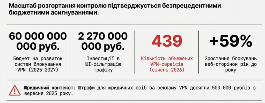 Масштаб розгортання інфраструктури контролю підтверджується безпрецедентними бюджетними асигнуваннями та інтенсивністю законодавчих ініціатив. У період з 2025 по 2027 роки на зміцнення технологій блокування VPN виділено близько 60 мільярдів рублів.4
