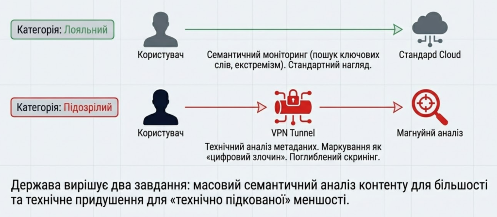 Системний аналіз показує, що використання VPN тепер розглядається державою не просто як технічна дія, а як індикатор «нелояльної поведінки».4 У цій логіці увага наглядових органів зміщується з факту використання платформи на її зміст та спосіб доступу. Якщо користувач заходить у сервіси без застосування засобів анонімізації, платформа працює у стандартному режимі, здійснюючи моніторинг публікацій та особистих листувань на предмет відповідності законодавству про екстремізм та дискредитацію влади. Однак застосування VPN активує протоколи поглибленого аналізу технічних метаданих.