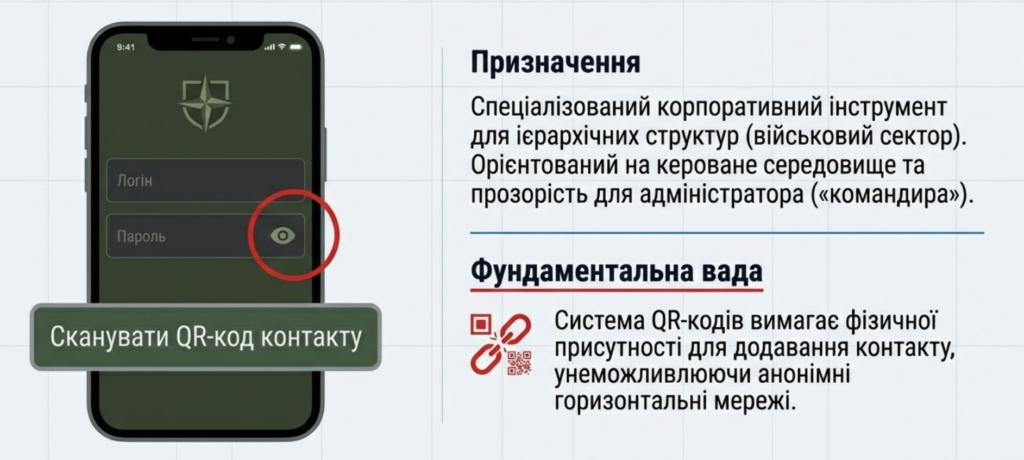Це перетворює месенджер на інструмент дисциплінарного нагляду, де кожна дія користувача може бути відстежена адміністратором («командиром») групи, що веде до повної самоцензури військовослужбовців та втрати будь-якого приватного простору для спілкування.