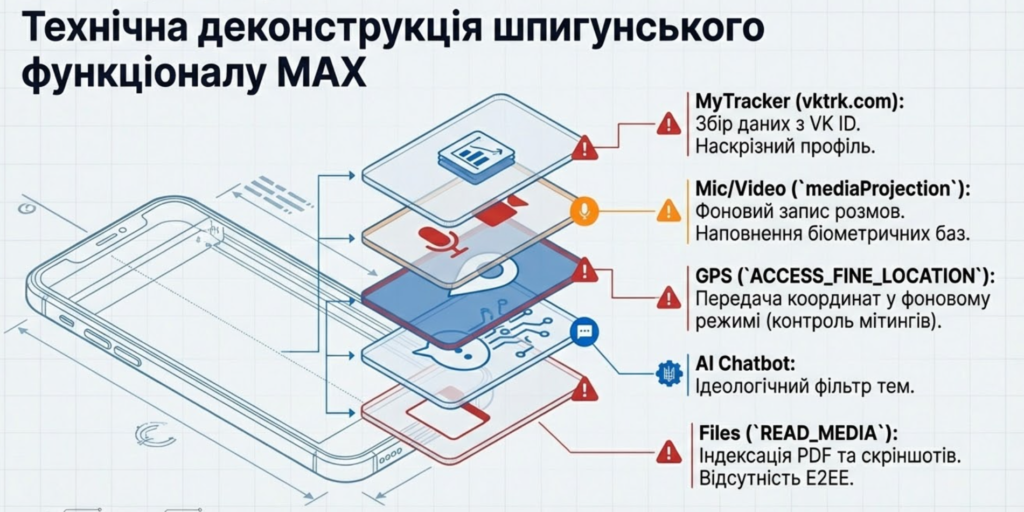 - Наскрізне профілювання користувачів: Додаток використовує аналітичний трекер MyTracker (vktrk.com), який збирає дані з інших платформ екосистеми VK (Одноклассники, ICQ, VK ID).8 Це дозволяє зіставляти анонімні акаунти в інших мережах з реальною особою користувача MAX, створюючи вичерпний цифровий портрет.8