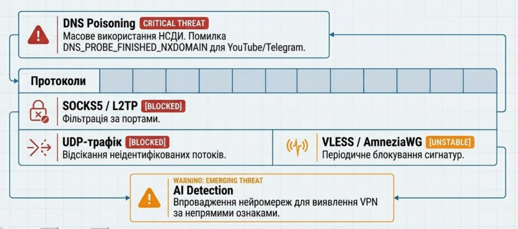 | SOCKS5 / L2TP | Заблоковані | Фільтрація за портами та сигнатурами 5 |
