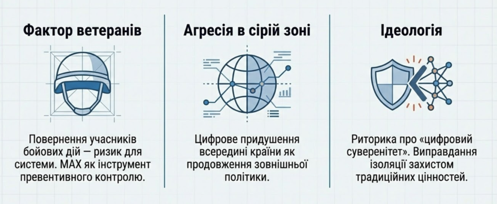 Впровадження «Цифрового ГУЛАГу» відбувається на тлі серйозних соціальних викликів, пов’язаних із триваючим військовим конфліктом та його наслідками. Влада розглядає повернення десятків тисяч ветеранів (включаючи колишніх в’язнів) як фактор ризику для системи особистої лояльності.19 У цьому контексті месенджер MAX та системи моніторингу VK стають інструментами превентивного контролю за потенційно нестабільними групами населення.