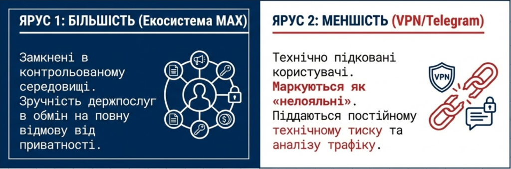 Основна «родзинка» державної політики полягає у створенні двоярусної цифрової реальності. Більшість населення опиняється замкненою в контрольованій екосистемі MAX, де зручність використання державних послуг обмінюється на відмову від приватності. Меншість, що зберігає доступ до вільного інтернету через VPN та Telegram, маркується як потенційно нелояльна і піддається постійному технічному тиску. Зрештою, ця політика веде до фрагментації глобального інтернету та формування суверенного цифрового середовища, де технології слугують не інструментом прогресу, а механізмом консервації влади та придушення громадянських свобод.