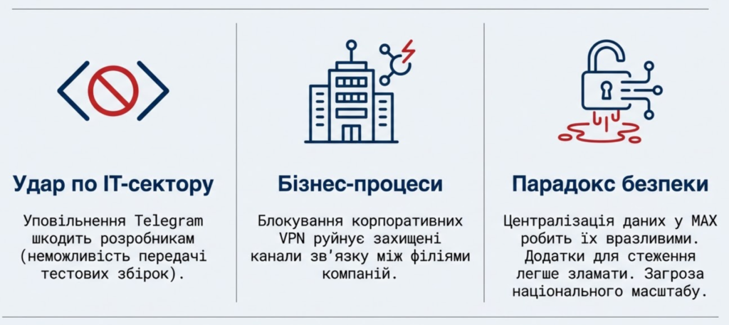 | Параметр стратегії | Telegram (Обмеження) | MAX (Впровадження) | Ефект для держави |